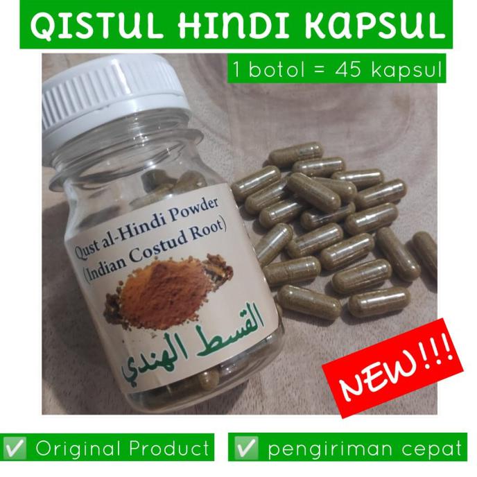READY ya kak, kalau kosong stock kami nol kan. jadi silakan langsung order.Karakteristik Costus Root Bau/Aroma : wangi khas kayuRasa : pahit di kemas dalam kapsul1 botol isi 45 kapsul.simpan di tempat yang kering dan sejuk (suhu ruang)minumlah 3-4x sehari sebanyak 2 butir*Qist Al Hindi* adalah Batang hitam yang diambil dari pohon bernama Al Qust (Costus). Habitat pohon ini berasal dari India.*Qust* ini digunakan dalam Thibun Nabawi untuk mengobati *Radang Penyakit Paru*. Batang al-Qust (Costus) mengandung bahan helenin dan asam benzoat yang keduanya merupakan materi yang dapat membersihkan bakteri. Karena itu, batang ini dapat digunakan untuk mengobati radang amandel, radang uvula (bagian langit-langit yang menonjol ke bawah), serta radang saluran antara rongga mulut dan kerongkongan.Berikut mengenai referensi quts al-bahri dan quts al-hindi yang terdapat dalam hadits Nabi Muhammad Shollallahu alaihi wasallam.Dalam Kitab Pengobatan dari Assauth dengan qusthul hindi dan qusthul bahri disebutkan:Telah menceritakan kepada kami Shadaqah bin Al Fadl telah mengabarkan kepada kami Ibnu Uyainah dia berkata: saya mendengar Az Zuhri dari Ubaidullah dari Ummu Qais binti Mihshan berkata: saya mendengar Nabi bersabda:Gunakanlah dahan KAYU INDIA, karena didalamnya terdapat 7 macam penyembuh dan dapat menghilangkan penyakit (racun) di antaranya adalah RADANG PENYAKIT PARU.Ibnu Saman dalam haditsnya: Karena sesungguhnya padanya terdapat obat dari tujuh macam jenis penyakit, di antaranya adalah RADANG PENYAKIT PARU (DADA).Lalu aku menemui Nabi sambil membawa bayiku yang belum makan makanan, lalu bayiku mengencingi beliau, maka beliau meminta air dan memercikinya. HR. Bu