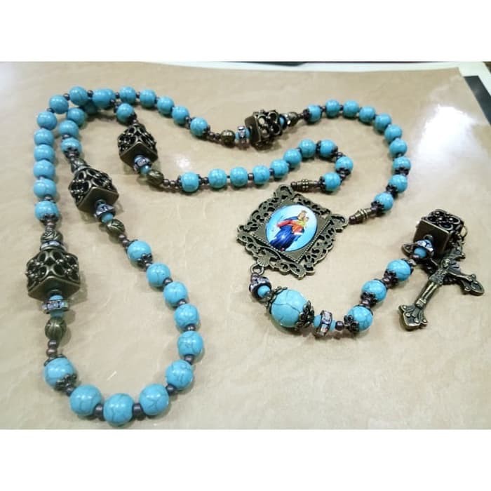 Deskripsi Rosario Unique Pyrus Biru LautRosario dengan model accesories dari metal yang unique bernuansa gothic dari batu pyrus warna biru laut.- Harces / Centerpiece yang berbentuk pigura kecil menonjolkan sosok "Blessed virgin Mary dan bayi Yesus dengan lebih menonjol dan terkesan sangat unique.Dibuat secara eksklusif hanya beberapa pieces sehingga tidak bakalan dijumpai ditoko manapun karena semua by hand