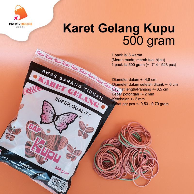 Karet Gelang Kupu 500 gram Diameter dalam +- 4,8 cmDiameter dalam setelah ditarik +- 6 cmLay flat length/Panjang +- 6,5 cmLebar potongan +- 2 mmKetebalan +- 2 mmBerat per pcs +- 0,53 - 0,70 gram1 pack isi 3 warna (Merah muda, merah tua, hijau)1 pack isi 500 gram (+- 714 - 943 pcs)Silakan Di Ord