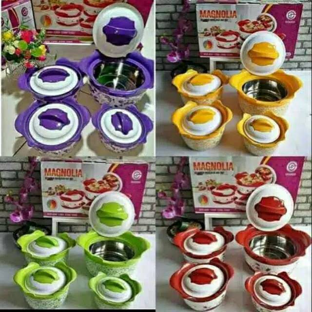Warner magnolia cocok untuk tempat makanan biar panas lebih awet karena ditengah lapisan Stenlis dan plastik terdapat sterofom yg dapat menahan suhu panas makanan. selain desainnya yang mewah kualitas lapisan plastik diluar nya juga sangat tebal. Panci terdiri dari UK 13,16,20,24 cm Spesifikasi produk : - Ukuran Panci : * 13cm :Diameter 11cm/ Tinggi 16,5cm ( 800 ml ) * 16 Cm: Diameter 13cm/Tinggi 18,5cm ( 1200 ml ) * 20 Cm: Diameter 16cm / Tinggi 18,5cm ( 2200 ml ) * 24 Cm : Diameter 19cm /Tinggi 19,5 cm ( 3200 ml ) - Bahan bagian luar plastik, bagian dalam stainless steel yang di lapisi dengan stereofoam sehingga makanan tidak mudah dingin.. NOTE: Tolong cantumkan warna di keterangan agar tidak terjadi pengiriman warna lain... Jika tidak mencantumkan warna di keterangan kami akan kirim r